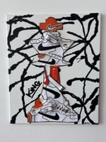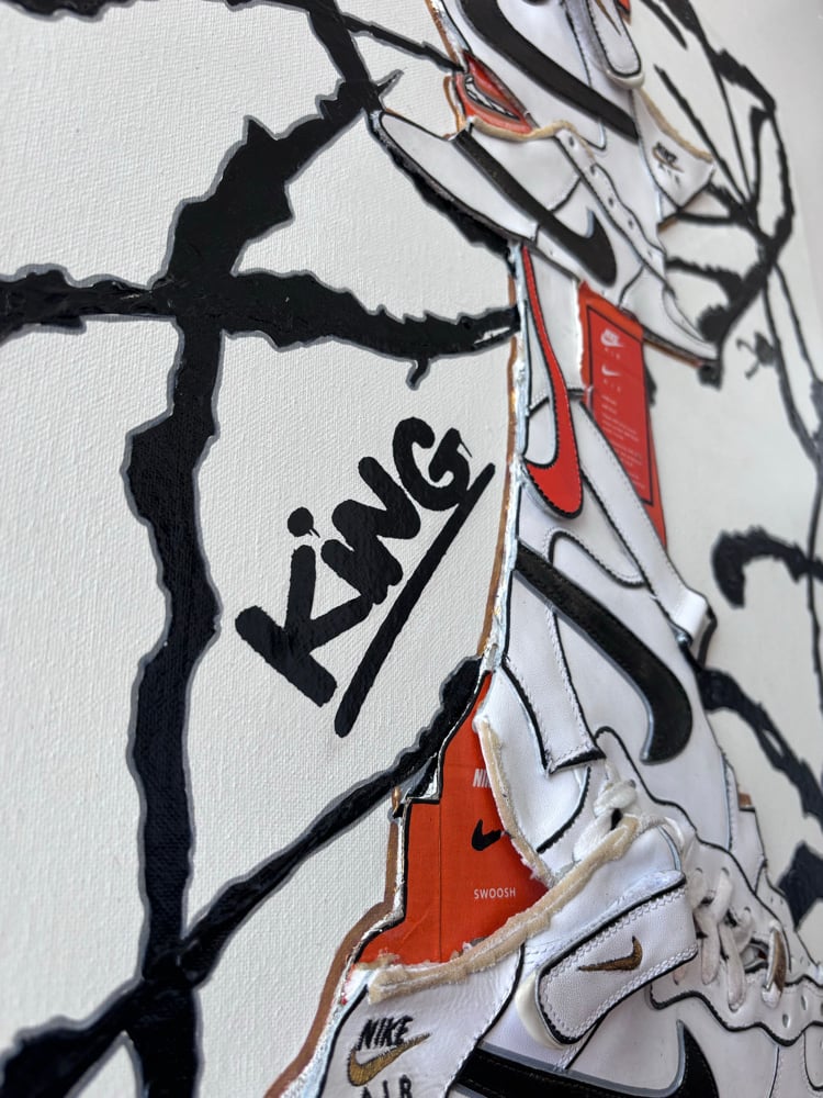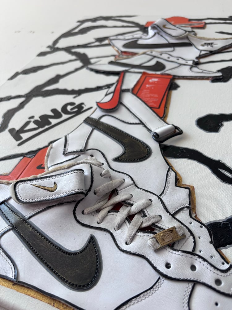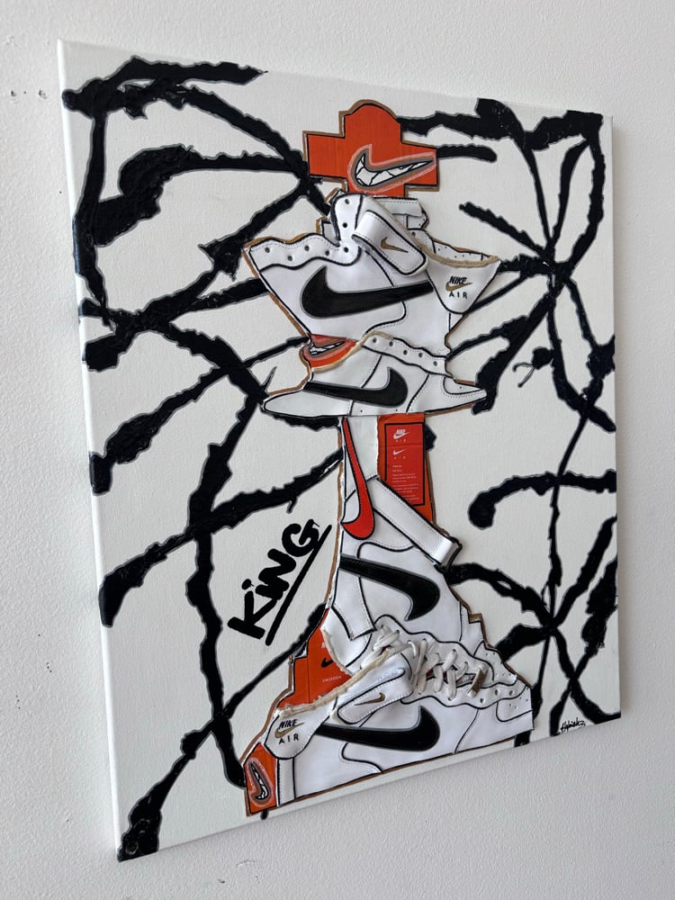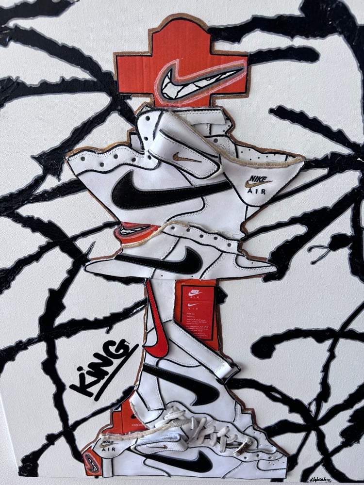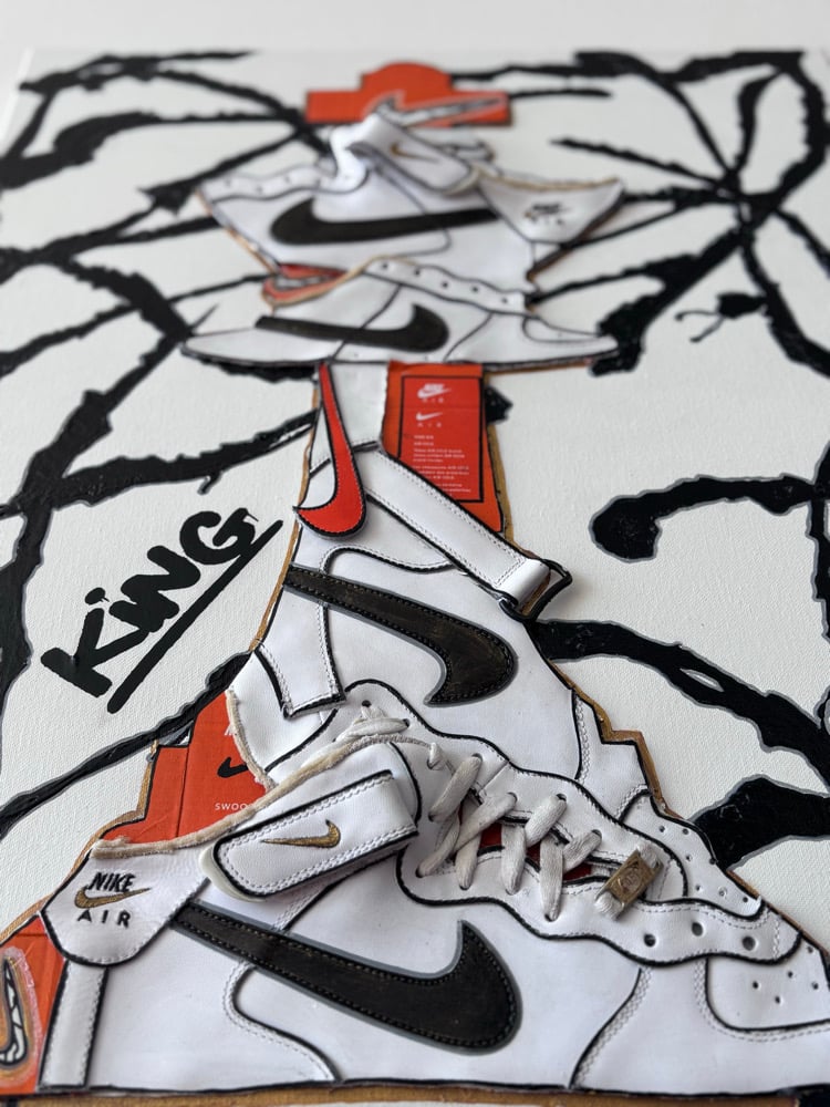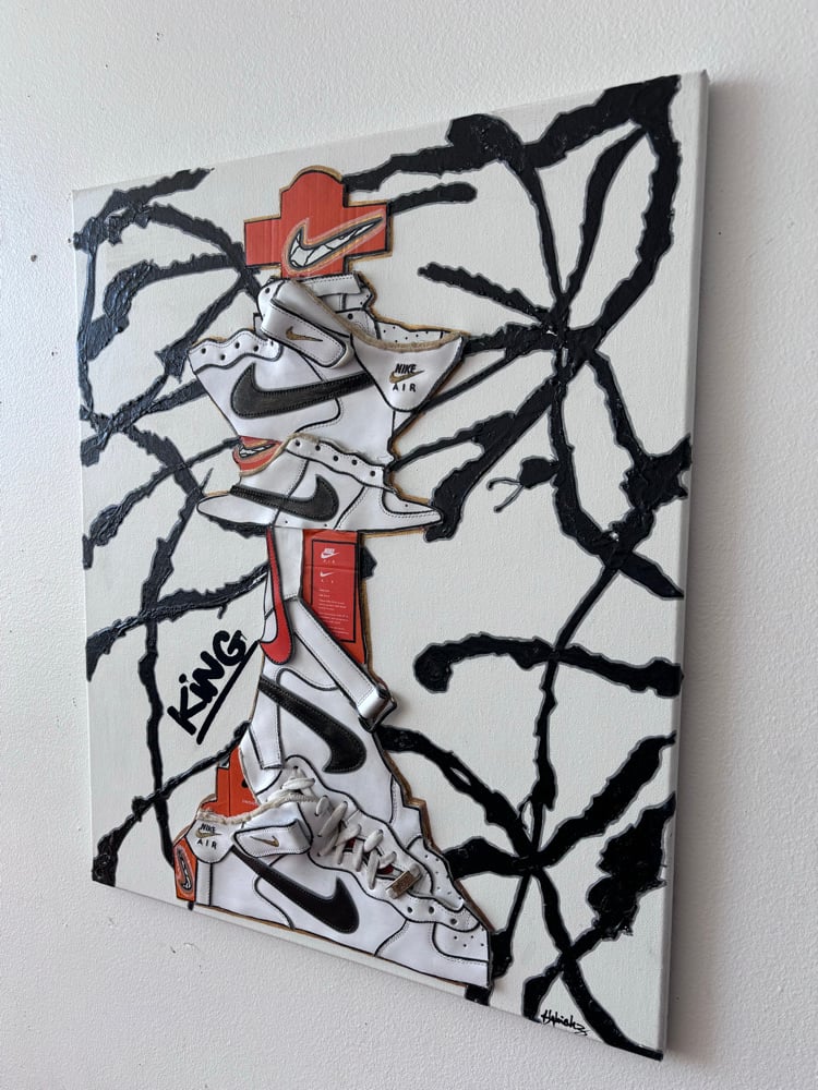 Created using Nike Air Force 1 sneakers, nike sneaker boxes and acrylic paint.