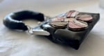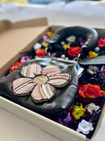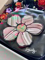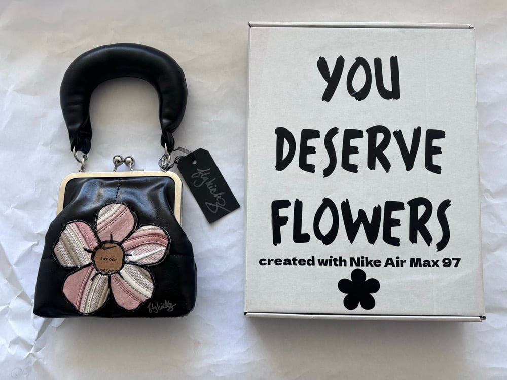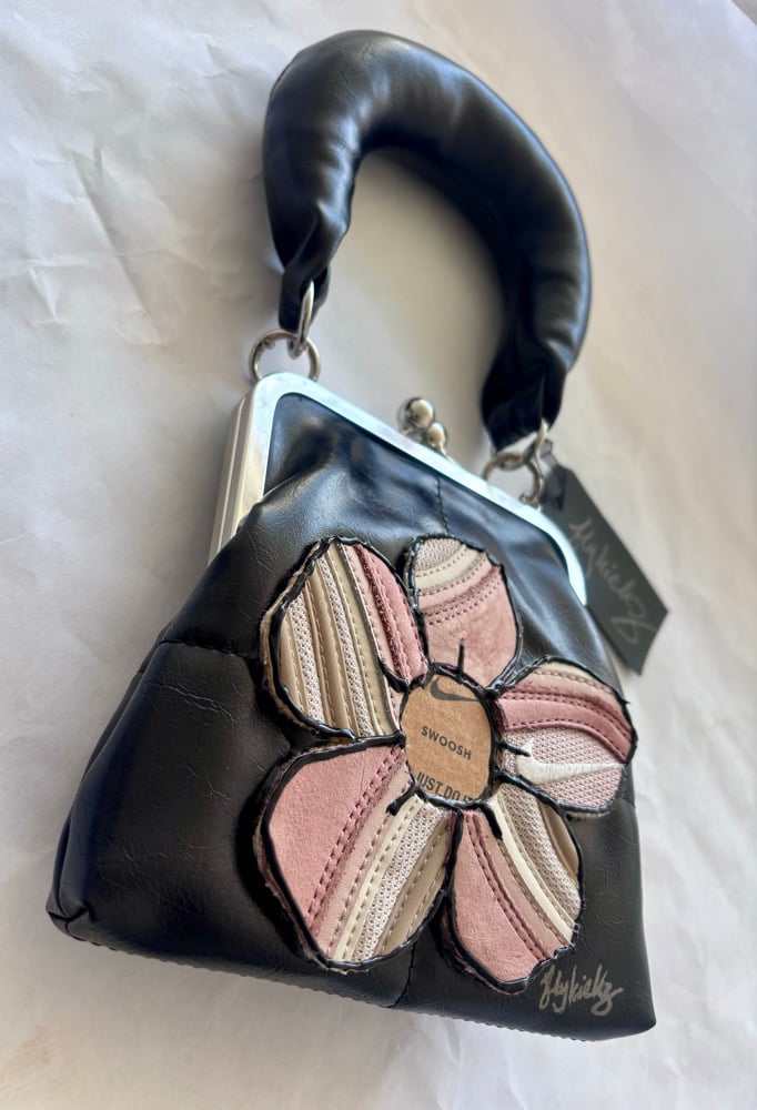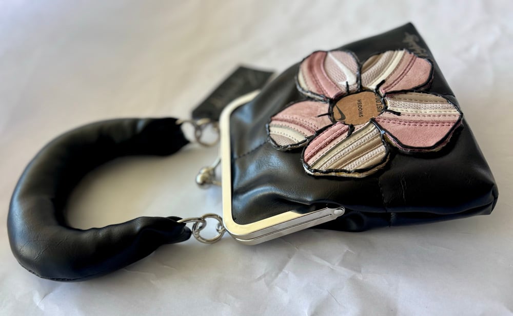 The custom five petal sneaker flower is bonded with a very strong adhesive, not sewn. Center of flower is made with a Nike sneaker box.